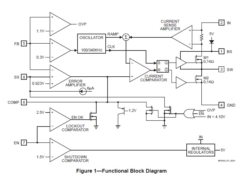 MP2309DS-LF-Z features: (1)1A Output Current; (2)Wide 4.75V to 23V Operating Input Range; (3)Integrated 140mΩ Power MOSFET Switches; (4)Output Adjustable from 0.923V to 20V; (5)Up to 95% Efficiency; (6)Programmable Soft-Start; (7)Stable with Low ESR Ceramic Output Capacitors; (8)Fixed 340KHz Frequency; (9)Cycle-by-Cycle Over Current Protection; (10)Input Under Voltage Lockout.